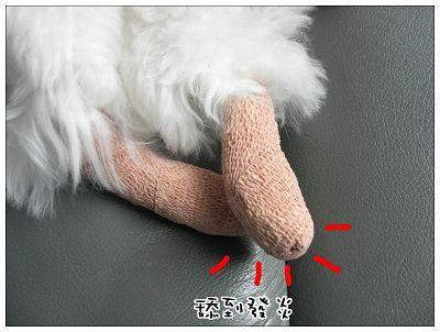 某個星期四下午,我們趕緊飛奔到獸醫院報到,結果耳朵果然輕微發炎,右手手指跟右腳腳趾也發炎,包一包就變這樣.........