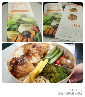 第一次什麼都覺得新鮮,看到高鐵便當的DM很誘人,決定點來吃吃看,便當共有兩種口味,照燒雞和照燒豬,每盒120元,算貴,我和山姆大叔合點照燒雞嚐鮮。