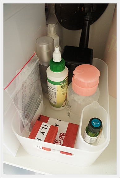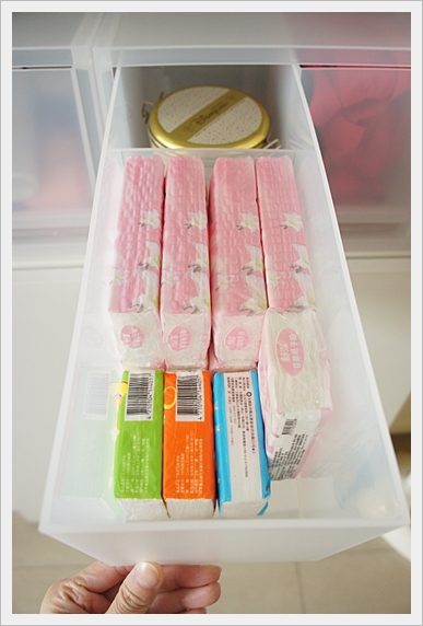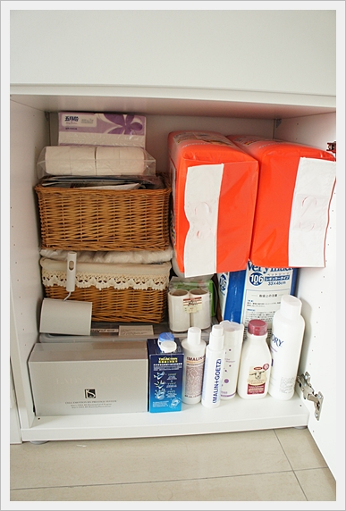 最下一層就是收各種清潔用品,包括洗髮精、沐浴乳、衛生紙、衛生棉、bibi的尿布等。