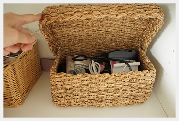 藤籃裡面收了一大堆電線跟充電器。