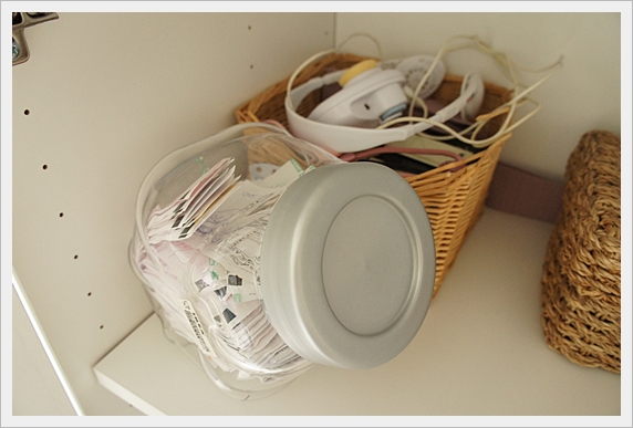 玻璃罐收發票,我都會先把發票掃瞄進手機裡,然後再收到罐子裡,對發票時只要用手機,沒中的話就通通丟,中的再找出來就可以,這樣就不用每次都要一張一張對。