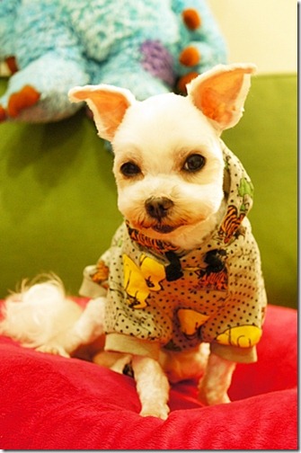 BTW,前陣子幫bi添購的小熊維尼帽踢和紅格子襯衫500元含運,喜歡的朋友可來信terri1026@gmail.com訂購。(此為人字拖小姮隨便賣的業務之一,日後會繼續採購可愛的狗狗衣服跟大家分享,敬請留意喔!)