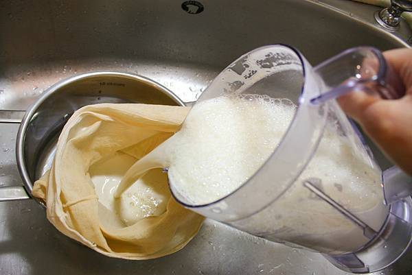 用過濾布濾出豆渣,這時候擠壓好的豆漿只是生漿而已,需要再加熱煮沸後,就完成健康的手工豆漿,是不是超級簡單。