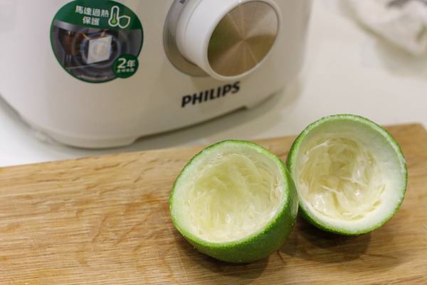 但是用了飛利浦廚神料理機,不只完全不費力將檸檬搾到一滴都不留,還超快根本不用一分鐘,看這已經搾到皮變很薄,完全沒有浪費。