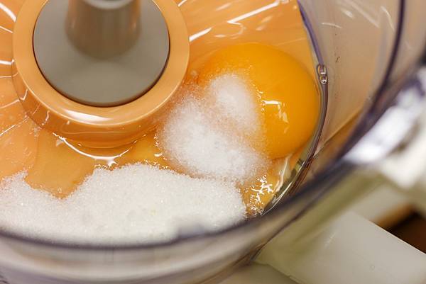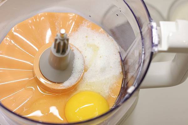 將整顆雞蛋、糖、鹽放進廚神料理機,輕鬆快速打散,油分次添加使兩者完全融合乳化。