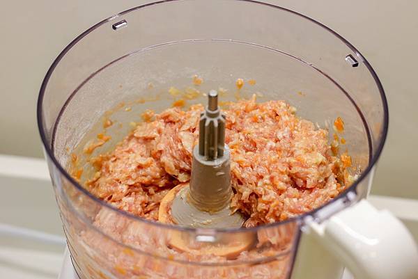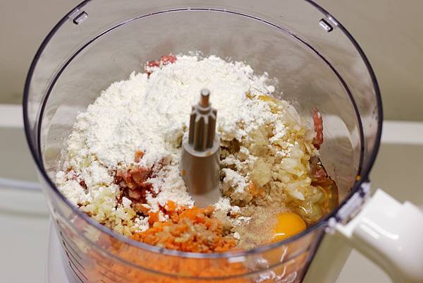 洋蔥和紅蘿蔔用料理機,以S型刀片輕鬆打成碎末。