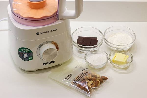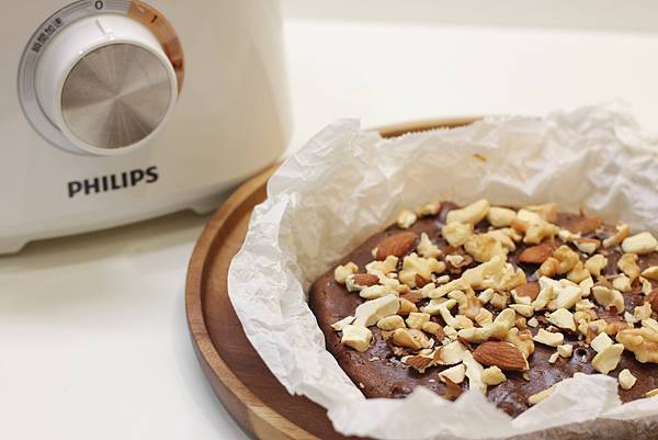 某個週末我還用飛利浦廚神料理機做了好吃的布朗尼,材料是巧克力50g(融化)、無鹽奶油30g(融化)、低筋麵粉30g(過篩)、糖30g、雞蛋1顆,無調味堅果份量隨性。
