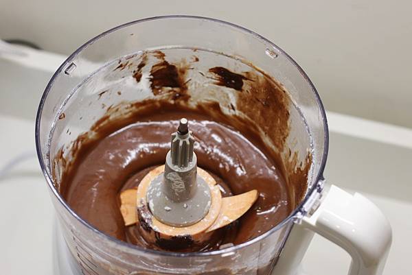 先用乳化盤將蛋及砂糖打發蛋糊,然後更換S型攪拌片,加入過篩的低筋麵粉及融化的巧克力、無鹽奶油,轉動旋鈕交給料理機攪拌,一下子就調和好巧克力麵糊。