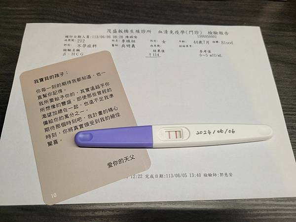 2024/5/24在台中茂盛醫院植入D5囊胚,原本預定6/5回台中驗孕,幸運的是迎來板橋茂盛開幕,後續回台中的診全部都轉到板橋,於是我在6/5先到板橋茂盛抽血,6/6回秉瑤醫師在板橋院區的診看報告。