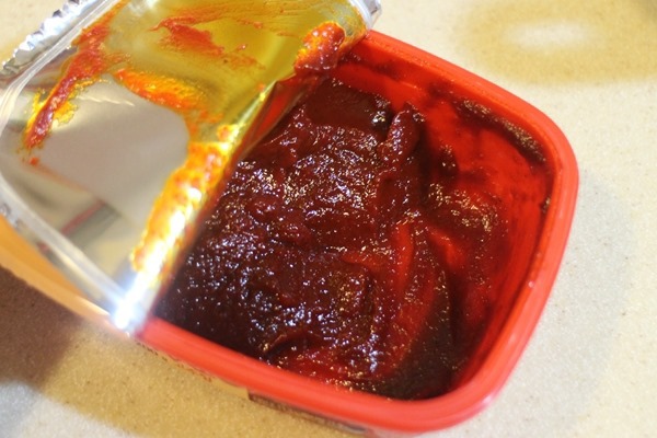 另外還要放韓式辣椒醬,就是做拌飯的辣椒醬,這種醬看起來很紅,但實際上並不辣,有的版本會再加韓國辣椒粉,雖然我今天也打包了,但懶得開所以沒放。