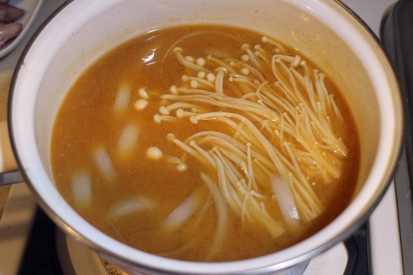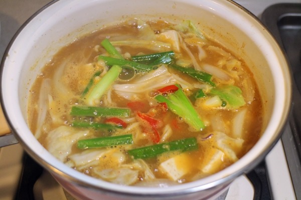 大醬湯裡比較常見的蔬菜是馬鈴薯和櫛瓜,這兩樣我沒有,我放的是高麗菜、金針菇、洋蔥、青蔥、辣椒、豆腐。