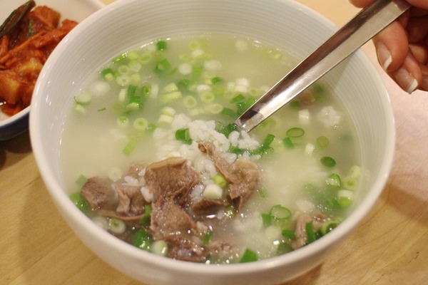 熬煮出來的雪濃湯是沒有添加任何調味料,上桌後客人自行加鹽、加胡椒、加辣椒粉,然後裡面一定有大量的蔥花,將湯頭的美味給提出來。雪濃湯會搭配一碗白飯,韓國人通常將飯倒進湯裡,搭配泡菜和蘿蔔一起吃。